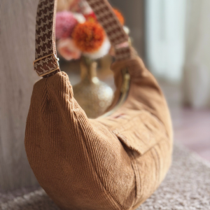Découvrez notre Sac Demi-Lune format L, une pièce unique au style affirmé et responsable. Confectionné à partir de pantalons en velours côtelés recyclés provenant de chez Celio, il valorise la seconde vie des matières tout en offrant un design moderne et intemporel. Avec ses dimensions de 33 × 29 cm, il est parfaitement pensé pour votre quotidien : assez grand pour…